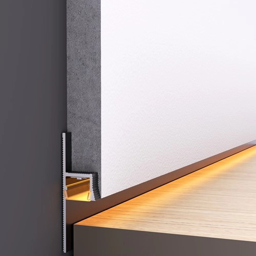 Dieses Alumium-Schattenfugenprofil zur Aufnahme von LED-Stripes ermöglicht eine durchgehende, beleuchtete Schattenfuge – für mehr Tiefe, Eleganz und einen architektonischen Akzent im Raum. Ein LED-Band sorgt für eine sanfte, indirekte Beleuchtung, die Innenräumen Wärme und Stil verleiht.