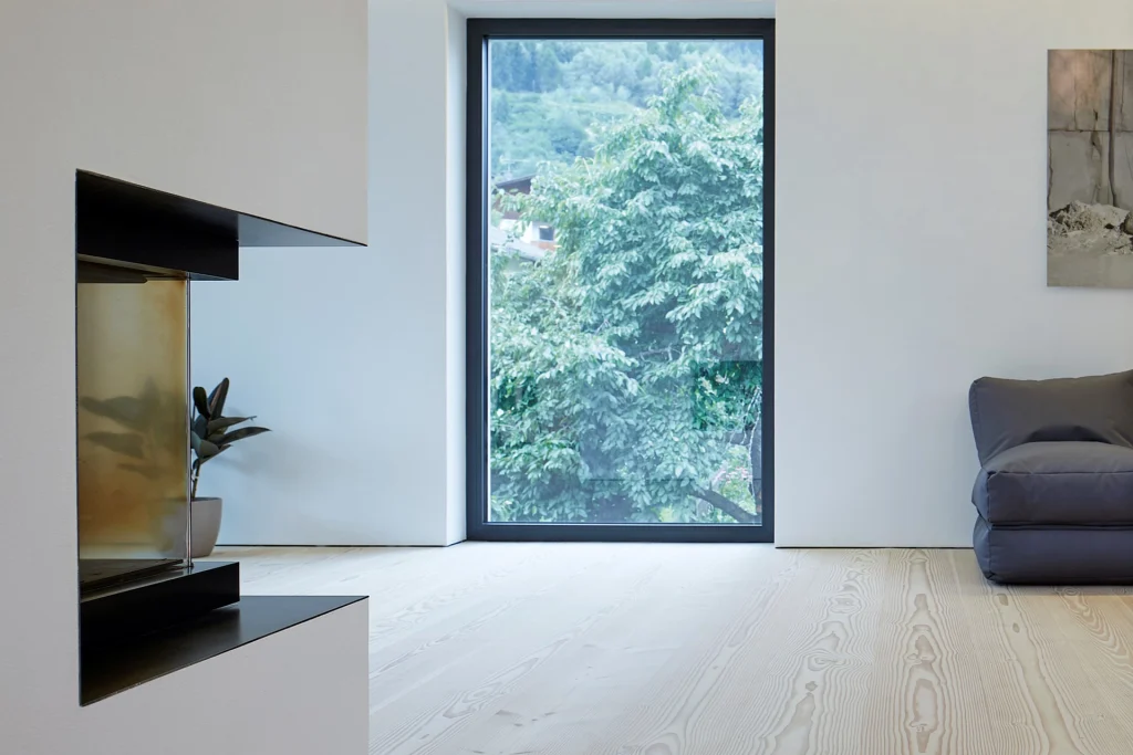 Die S20 Schattenfuge schafft eine elegante Trennung zwischen Bodenbelag und Wand und unterstreicht damit die moderne Formensprache des Raumes. Der präzise Spaltverlauf sorgt für eine schwebende Optik der Wandflächen und verleiht dem Bodenbereich eine hochwertige, lineare Struktur.